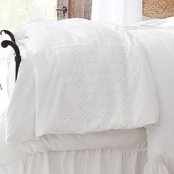 Brand new King size white embroidered eyelet duvet cover from Pottery Barn. Button closure with interior ties to help keep comforter in place. Lovely, clean pattern. 85% Cotton / 15% Linen. Never been used. I've amassed a lot of white duvets and need to unload some of them. No longer available in stores. Please feel free to reach out with any questions. Thanks