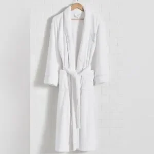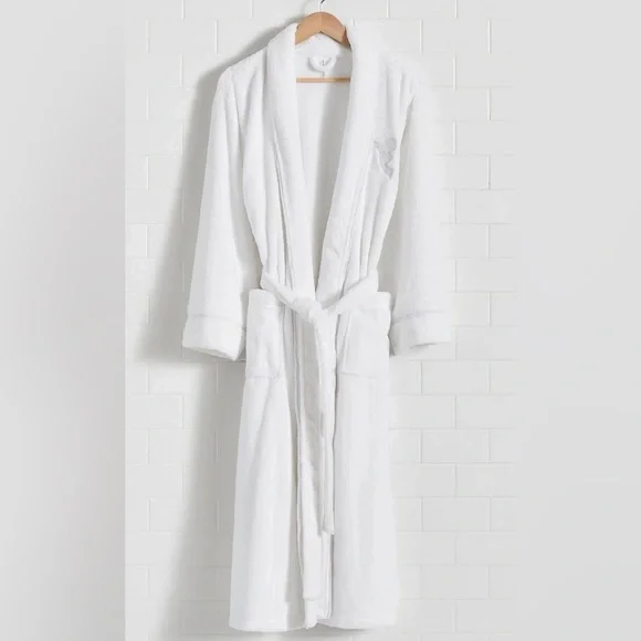 Luxurious white robe. Soft and comfortable. Perfect for relaxation. I would consider this one size. It can easily fit a medium and large. I’m 5’6 and it’s almost ankle length. Never worn, has tags still attached