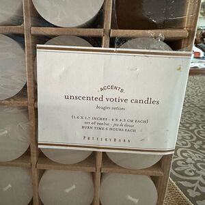 for sale: candles from pottery barn ( 12 pc unscented lot of votives) - measurements are in photos; this set has 1 missing candleas seen in the photos and a gently and barely used Rae Dunn large tis the season 3 wick candle