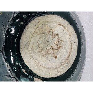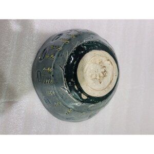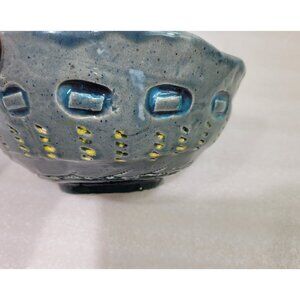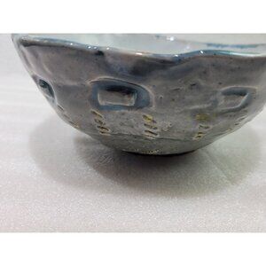 Unique pottery bowl. Approx 7-1/2" across the top and 3-3/4" tall. Textured hand made bowl with blue, gray and small areas of a yellowish green. Flower stamp on the bottom. No chips/cracks. Beautiful piece - smoke free.