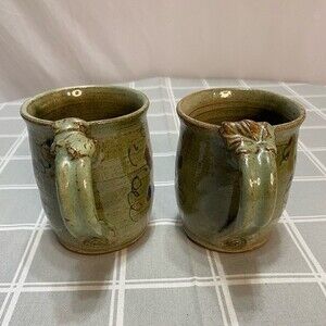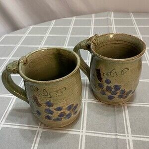Pottery Coffee Mugs Grape Vine Primitive Handmade Artisan Crafted Set of 2 Cups