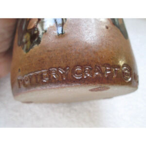 Very attractive, very little use, if any, nice bright drip glaze in multi-color browns, signed Pottery Craft, USA, around front of vase bottom. No damage.