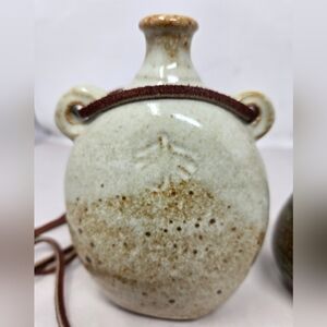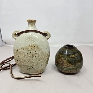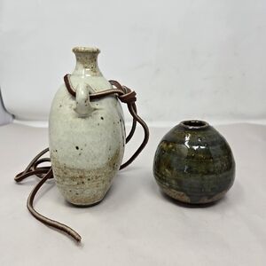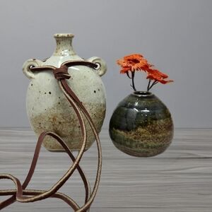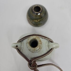 Pottery Handmade Vintage Japenese Small & Medium Vases Tan-leather Tie & Green