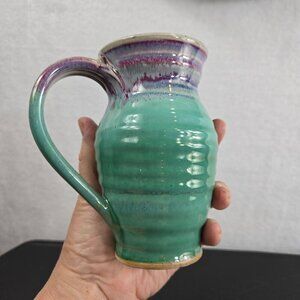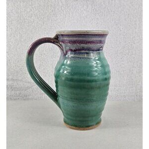 Pottery Mug Stoneware Cup 5.5" Teal Purple Ridged Curved Unique Shape Big Handle