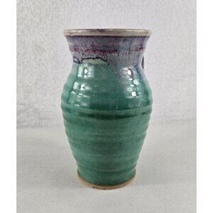Beautifully shaped pottery mug with curved hourglass shape toward the top. Handcrafted and signed on the bottom. Glossy teal and purple colors. Excellent condition, no chips or cracks.