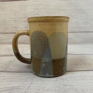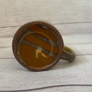 Pottery mug in brown, blue, and cream colors. The bottom has a swirl on it. It measures approximately 4 1/2" tall x 5" wide, including handle. The top is 3 1/4" in diameter.