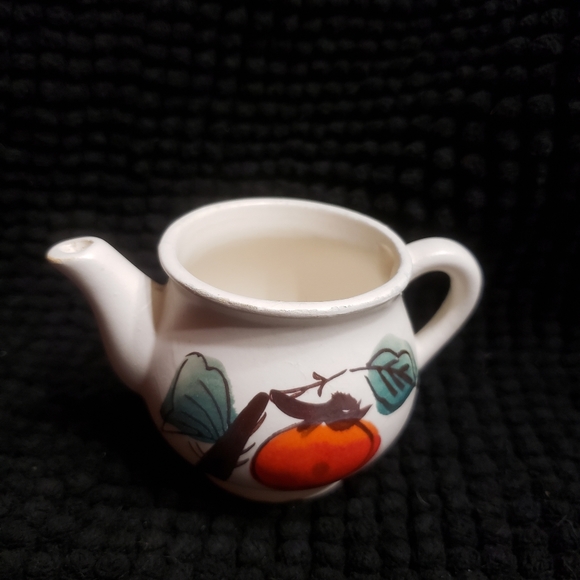 Old pottery pitcher with fruit design. Pet friendly home. 3" X 4" X 2 1/2".
