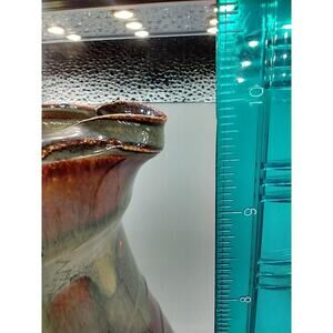 This vintage pottery pitcher features a beautiful green and brown color scheme with an applied handle for easy pouring. The stoneware and ceramic materials used in its production give it a unique look and feel that is sure to impress. The pitcher is stamped and signed with an unknown origin, adding to its charm. With its decorative yet functional design, this pitcher is perfect for serving beverages or as a decorative piece in your home.