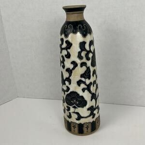 Pottery Vase with Floral Vine in Black, White and Tan. 12 Inches tall. Base is about 3.5 inches across. Neutral color Home Decor item. No chips or cracks. There are a couple of scuff/scratches around the top - see picture.