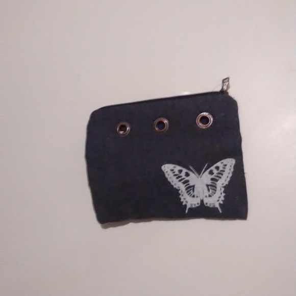 Butterfly Zip Pouch. Denim with a White painted Butterfly. Perfect for cosmetics, money and more. Size is 6" x 8" approximately.