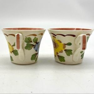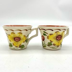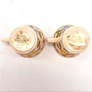 This 90 year old rare set of two 1930's Bristol Pountney & Co “Amberone” 1339 design ironstone cups and saucers are in excellent condition! Features a cream background, a salmon pink and green border on the rim of the saucers and inside rim of the cups, finished with blue, yellow and pink flowers and green leaves in the center of the saucers and all around the outside of the cups. Cups are approx 3” across the rim and 2.75” high; saucers are 5.5” diameter. Price is for both sets.