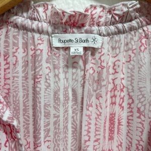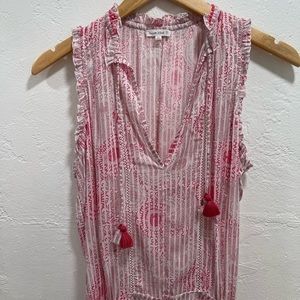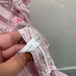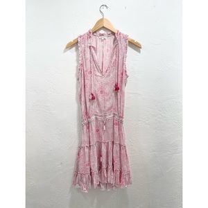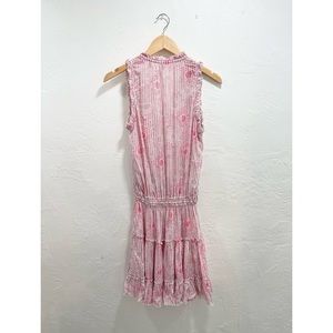 Condition is pre owned. No holes or stains. Splitneck with self-tie. Sleeveless. Pullover style. Smocked self-tie waistband. Tiered ruffle skirt. Viscose.