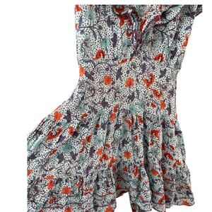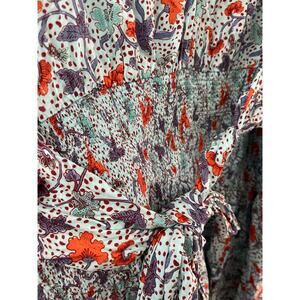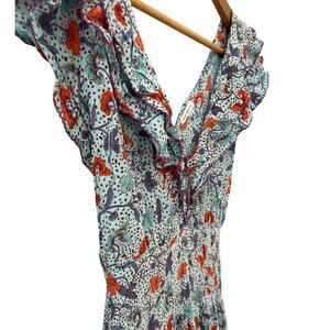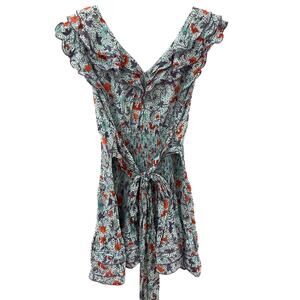 Chic floral midi dress by Poupette St. Barth. Features a vibrant blue and red pattern. Ruffled sleeves and a flattering waist tie.