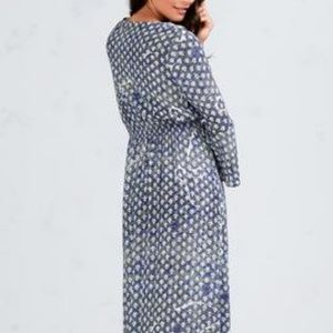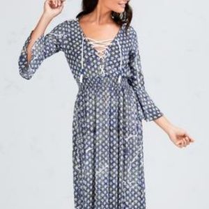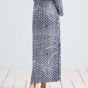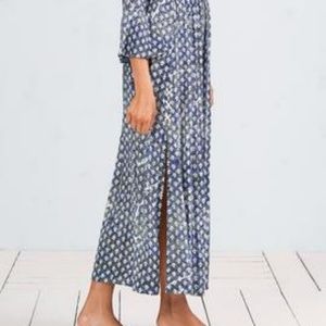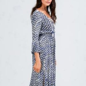 The long dress is a Poupette St Barth original design bursting with retro gypsy glamour. The deep open front neckline has grommets with tassel tipped laces meeting a gathered elastic waist for an easy blouson shape. Ruffled sleeves further the boho chic factor while deep side slits with lace detail add a totally modern edge. Viscose crinkle. Dry clean or hand wash, cold. Hang to dry.