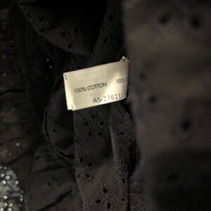 Textured details run along the neckline, and the cotton eyelet lace along with the ¾ balloon sleeves add a touch of whimsy, creating a graceful and ample silhouette with numerous pleats and folds.