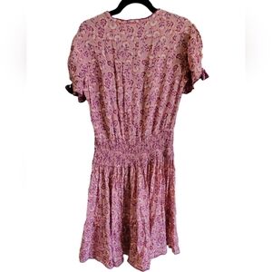 An expression of romantic charm, this dress features puff sleeves, a V-neckline enhanced by double picot stitching, and elegant pleated shoulders