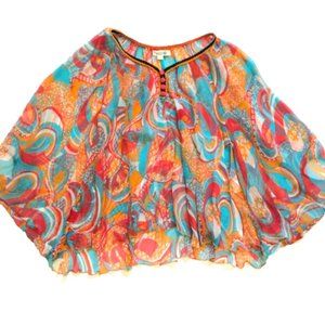 Poupette St Barth Poncho Blouse Top Shirt Womens OS Orange Blue Sheer VNeck Silk