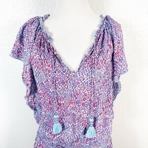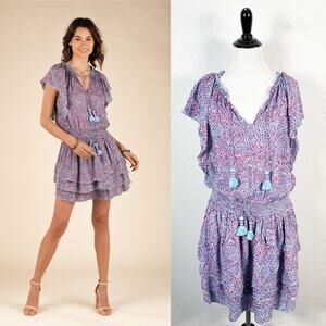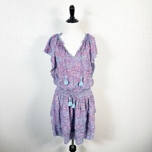 Chic mini dress with ruffle details. Features a playful tassel tie. Perfect for casual outings.