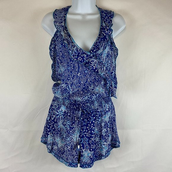 Poupette St. Barth Romper XS Blue White Firework Print Sleeveless Ruffle Racer Back Elastic Waist New NWT
