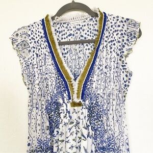Poupette St. Barth Sasha Dress; A tassel-trimmed neckline and shutter pleats give this swingy mini dress beautiful dimension. Stand collar. V-neck. Short sleeves. Pullover style. In multi.