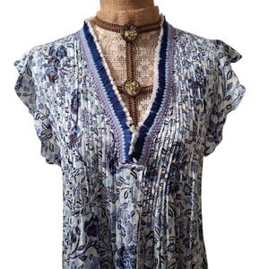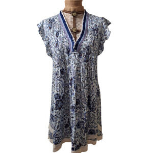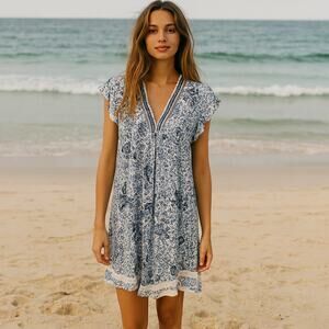 Lightweight blue and white printed dress with flutter sleeves and a relaxed fit, perfect for a breezy beach day. Featuring a V-neckline with contrasting trim and an airy silhouette, this dress offers effortless summer style. Comfortable and chic, it’s ideal for seaside strolls, vacations, or casual warm-weather outings.