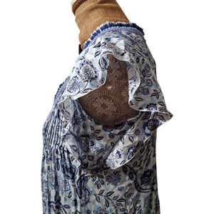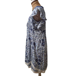 blue and white dress, beach dress, flutter sleeve summer dress, boho print dress, V neck casual dress, lightweight vacation dress, seaside outfit, airy beachwear, coastal style dress, feminine summer fashion, bohemian casual dress, warm weather attire, relaxed fit sundress, trendy beach aesthetic, boho chic printed dress