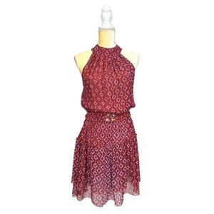 Style Description: Silk mini dress with halter top and tiered ruffled skirt | Keyhole back with two button closure at the neck | Shirred (elasticized) fabric belt with snap closures ini dress | Allover abstract pattern