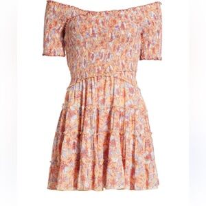 A feminine smocked bodice and playful tiered skirt shape this adorable printed orange floral mini dress by Poupette St. Barth. Size M, worn twice and in great condition with no rips, stains or tears. Retail $345.