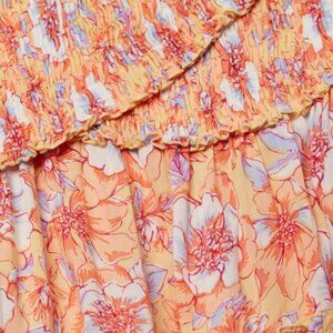 Fitted, smocked bodice with crossover styling. Tiered skirt with ruffles.