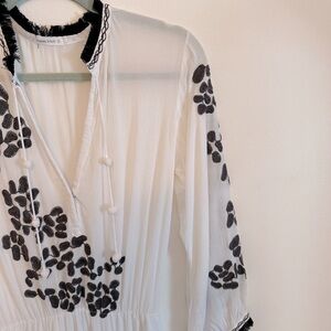 Chic mini dress by Poupette St. Barth. Features elegant black floral patterns on a white base. Perfect for casual outings.
