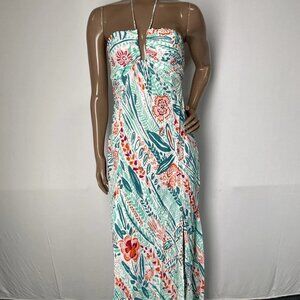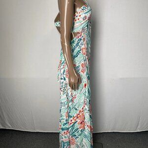 Features: Halter neckline, side slit, flowy skirt, lightweight fabric, tropical-inspired print