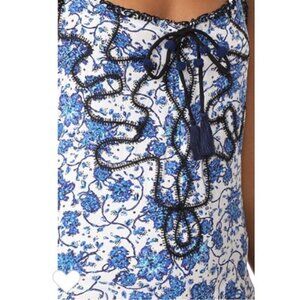 A lightweight Poupette St Barth jumpsuit in a floral print. Appliqué designs add a hit of texture, and tasseled drawstrings cinch the halter