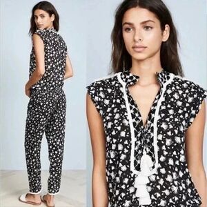 Chic and effortlessly bohemian, this Poupette St Barth Donna Jumpsuit features a relaxed silhouette in a black-and-white print. Designed with flutter sleeves, a deep V-neckline accented by delicate white crochet trim, and playful oversized tassel ties, this piece blends comfort with style. The elastic waistband flatters the figure while allowing easy movement, and the tapered ankle-length legs give it a modern finish. Perfect for vacations, beach getaways, or casual summer days.