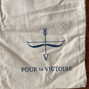Pour La Victoire dust bag cover 14 1/2 inches long by 10 1/4 inches wide. Condition. Drawstrings at heart. Gently preowned condition.