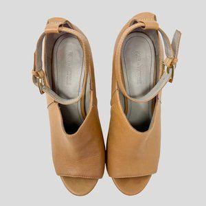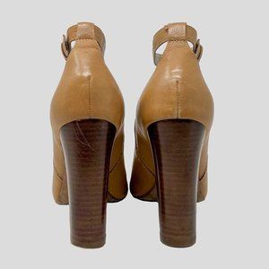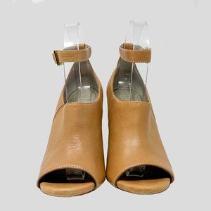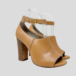 Pour la Victoire open-toe tan leather heels with ankle strap. Block heel in wood. Gold-tone hardware.