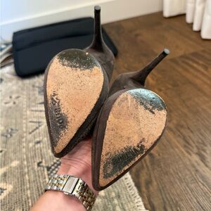 Chic dark brown suede heels. Sleek design with pointed toe and slight platform. Ideal for stylish outings.