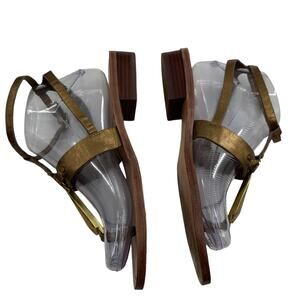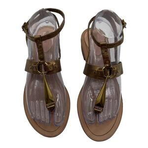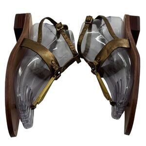 Pour La Victorie Acadia gold sandals. Thong toe. Adjustable ankle strap with buckle closure. Gold tone hardware. Leather upper, lining, and sole. In preowned condition.