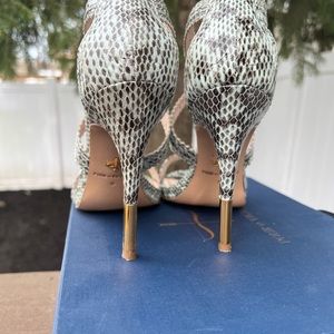 These 4" Pour la Victorie Shanna heels has been gently worn twice and is in good condition. There is wear on the bottom of the shoes. The ties are in good condition and this fits like a true 8’s. Snakeskin print MINT MARBLE SNAKE with light mint ties and scalloping.