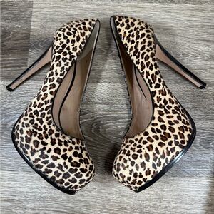 Pour La Victoire Women’s Sz 8 Cheetah Print Fur Heels – 5” Heel, 1.5” Platform heels with Vero Cuoio Leather