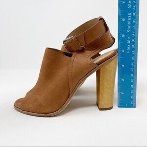 Pour La Victoire Suede Tan Brown 4" Wood Block Heel Peep Toe Mule Ankle Strap 6