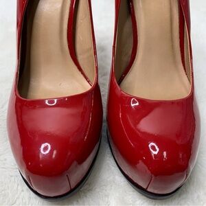 Pre owned authentic Pour La Victoire Women's Red Irina Platform Pump Patent Leather Heels Size 9.5. Heel is 5” inches. Has some marks. Has a micro hole in inner area. Overall great preloved condition. Please look at pictures for better reference. Happy Shopping! NDEC23. M4