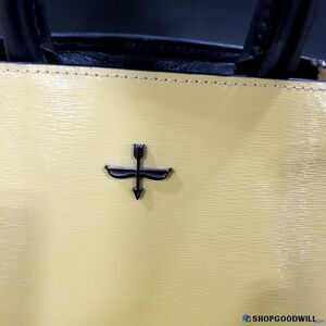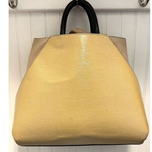 Beautiful and unique Pour La Victoire origami handbag/satchel. The interior and exterior of the bag are in good condition with just a few marks on the bag. See pictures. The combination of light yellow and cream with the black handles looks so good. This one is rare and unique!