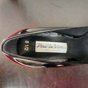 Pour La Victorie Dione Black Patent Leather High Heels, Red Heel Detail, Vero Curio = True Leather, SZ 8.5 (4” heel) Sexy, Date Night, Girls Night Out, Dressy, Unique, Glam, Fancy, Bougie, Mob Wife (small scuff on left heel - see photo)