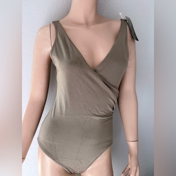 Stylish olive green wrap bodysuit. Perfect for any occasion.