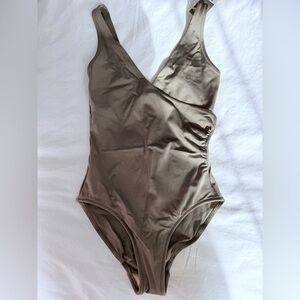 Pour Moi? Azure Tummy Control Swimsuit Shimmer Olive Green One Piece Wrap Front