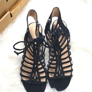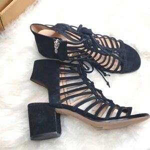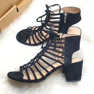 Pour la Victoire Amabelle Black Suede Block Heel Lace Up Caged Sandals 8…