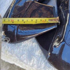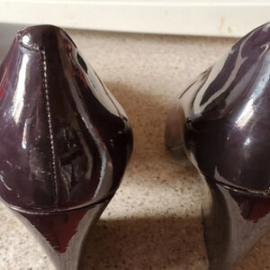 So deep gray with metallic accents. Gray is the new black! So dark they can pass as black. The angular heel is very flattering. Some scuffs at heel backs.