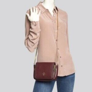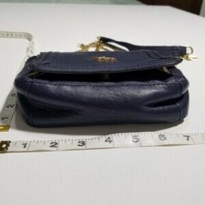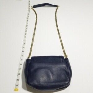 Italian leather in navy blue with a gold flat snake chain strap and hardware. Fold over flap top with snap closure. Two exposed zippers with chunky pulls. Almost square shape is approximately 7.5 x 6 x 2" which is small to medium size. Strap is about a 19" shoulder drop. Includes dust bag for storage. Pour La Victoire logo on front center. Elegant preppy timeless classy chic cross body purse. In excellent condition with no damages or flaws, it's like new. From my smoke free home. Retail $195 at Anthropologie.