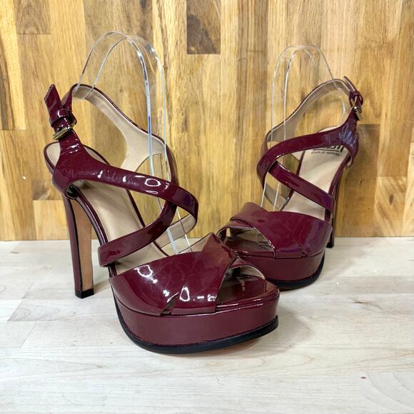 Pour le Victoire Burgundy Patent Leather Platform Strappy Heels 9