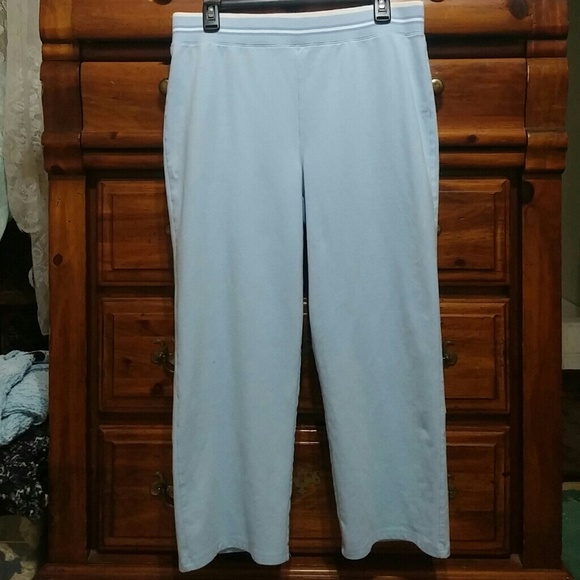 Very nice cool & soft, powder blue, very stretchy, comfy capris. Has elastic waist band. no zippers, buttons or hooks. Clean no rips, tears or stains. Waist 16.5, inseam 25", cuff opening 9". sz L.